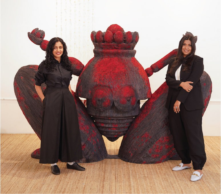 The sculpture began with thousands of hand-carved wooden elements from the Etikopakka toy-making tradition of Andhra Pradesh, using native Ankudu wood. These were integrated by master artisans at the Chanakya School, who stitched and knitted them into a richly textured surface comprising six layers of jute and cotton embroidery. This intricate surface is anchored by a concealed steel architectural body, allowing the monumental form to maintain a sense of lightness and porosity.